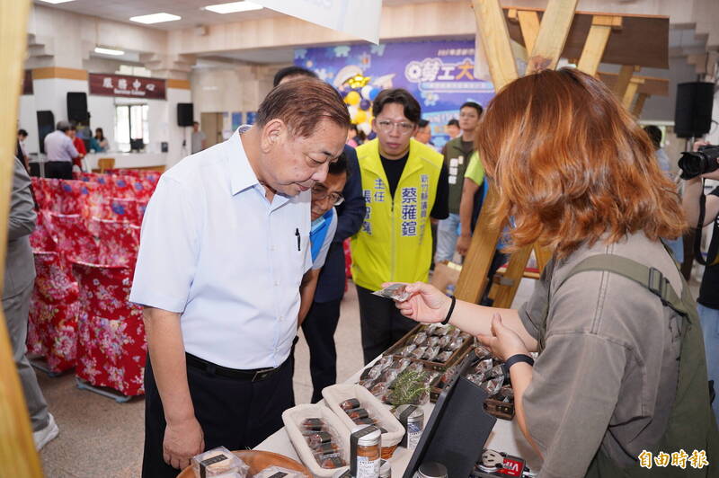 新竹縣副縣長陳見賢實際了解,微型創業的勞工朋友實戰成果。(記者黃美珠攝)