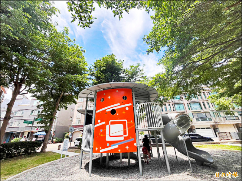 竹北市光明十街深耕公園新設的「星際堡壘」,有迴旋式溜滑梯、樓梯與觀景平台,宛如通往宇宙核心的指揮艙。(記者廖雪茹攝)