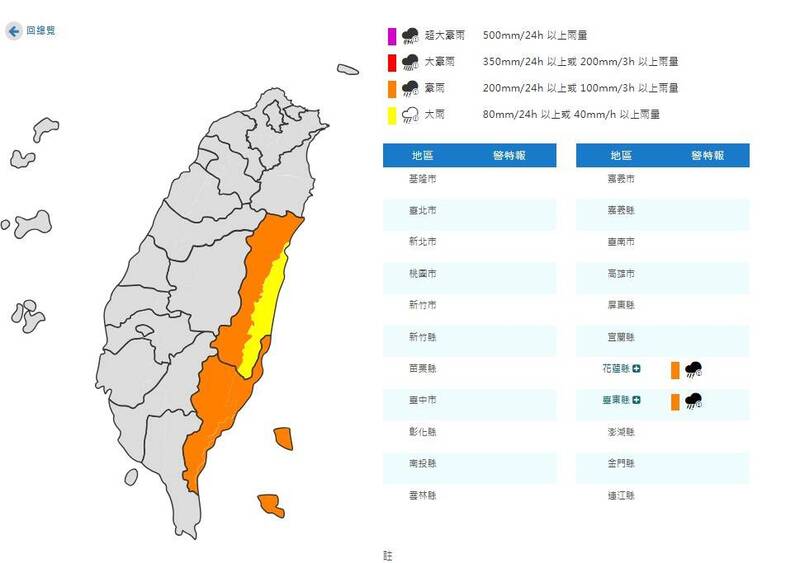 大雨特報警示範圍為花蓮縣平地地區;豪雨特報警示範圍包含花蓮山區地區與台東縣。