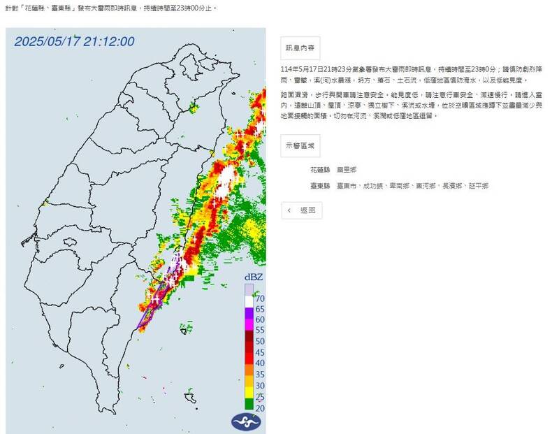 氣象署晚間9點23分也對花蓮縣及台東縣發布大雷雨即時訊息,持續時間到晚間11點。提醒民眾劇烈降雨、雷擊,溪(河)水暴漲,坍方、落石、土石流,低窪地區慎防淹水,以及低能見度。