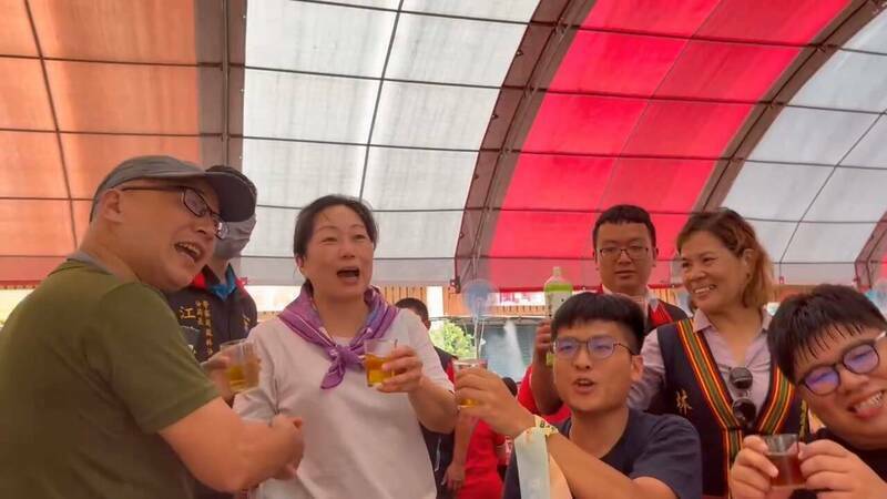 客庄鳳梨饗宴12日辦桌,徐榛蔚到罷團桌要敬酒,遭罷團成員直球對嗆「罷免傅崐萁,票投不同意」。(罷團提供)
