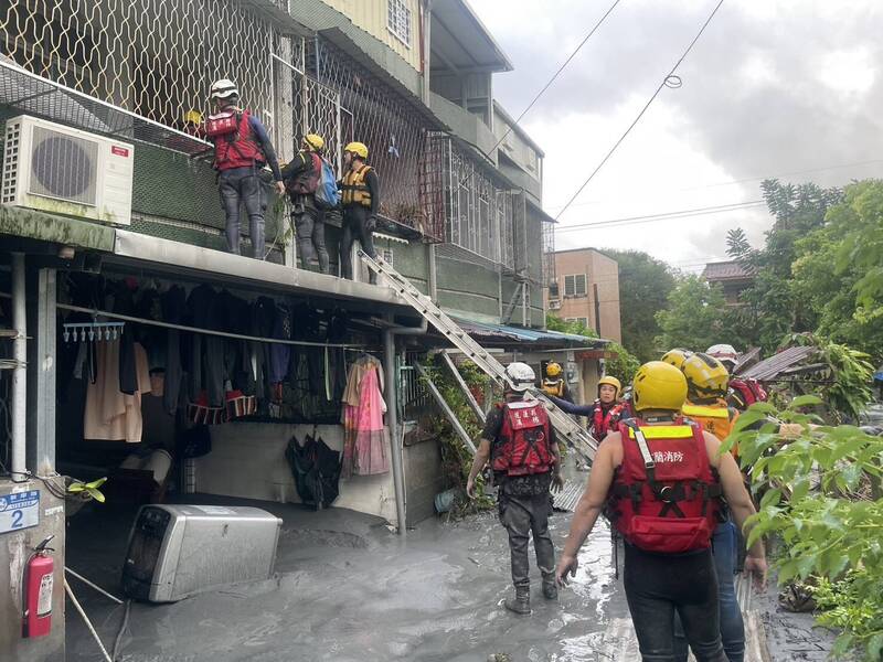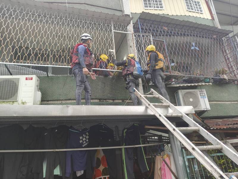 宜縣消防局救災人員架梯上樓協助民眾脫困。(圖由宜縣消防局提供)