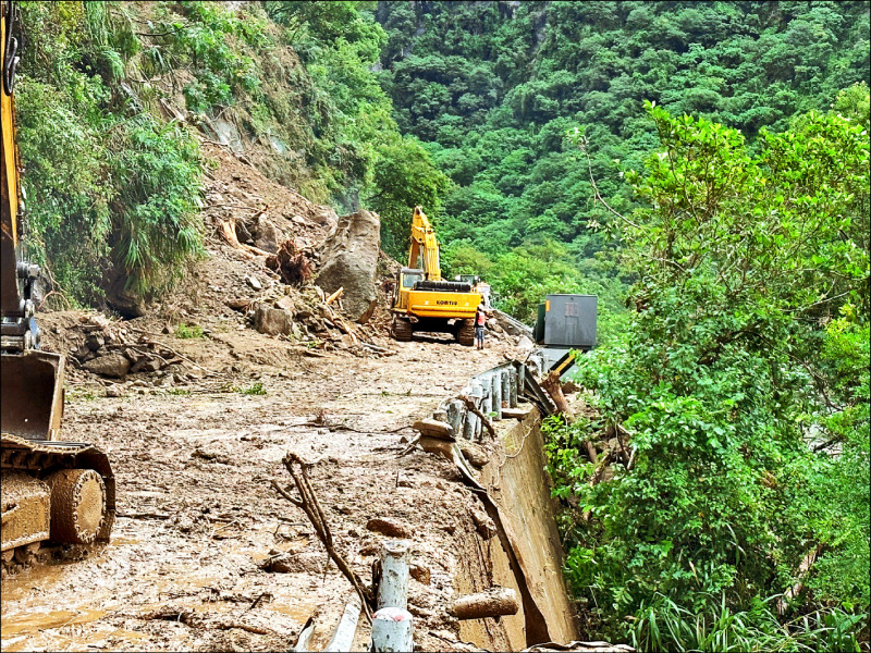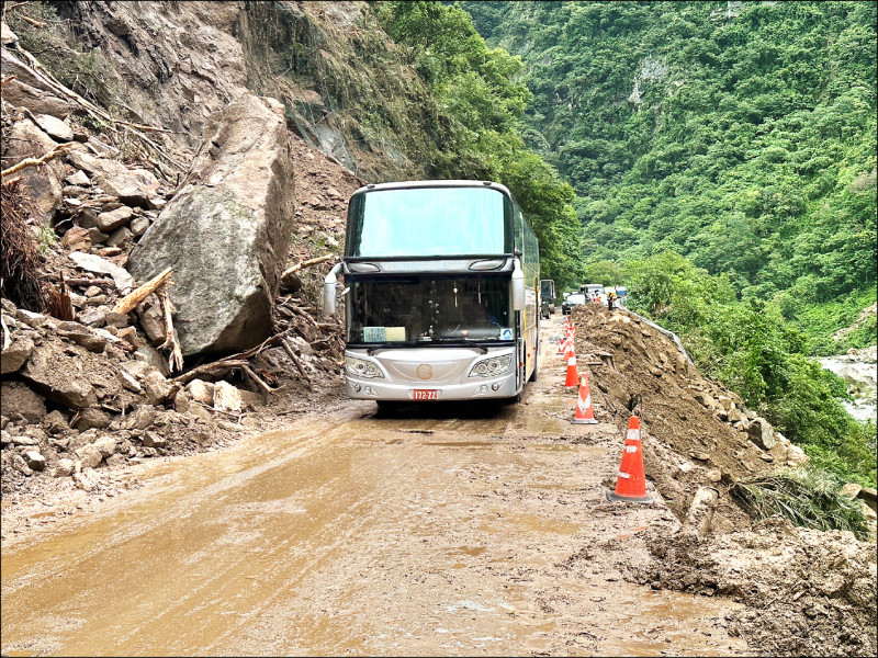 台8線溪畔段179.5K前天下午大坍方,昨天上午11時搶通後,下午2點起實施2小時一次的戒護通行。(公路總局提供)