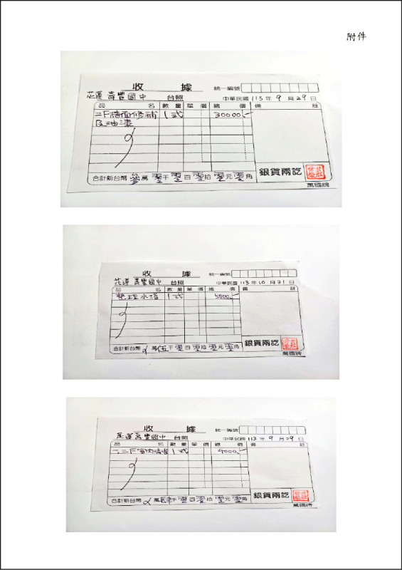 花蓮縣壽豐國中教師自行修繕宿舍,教師被迫自掏腰包,提供修繕單據為證。(花蓮教師會提供)