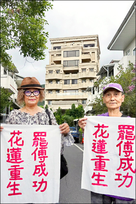 花蓮罷傅精神領袖葉霸(右)偕同東華大學退休的潘小雪(左),兩位老師昨天到傅崐萁豪宅前快閃,表達「罷傅成功,花蓮重生」。(罷團提供)