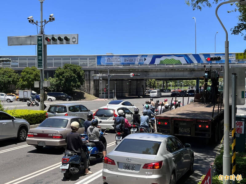 中山高中正交流道匝道常塞車且回堵至市區道路,市府採東側重配置車道使用方式因應。(記者黃良傑攝)