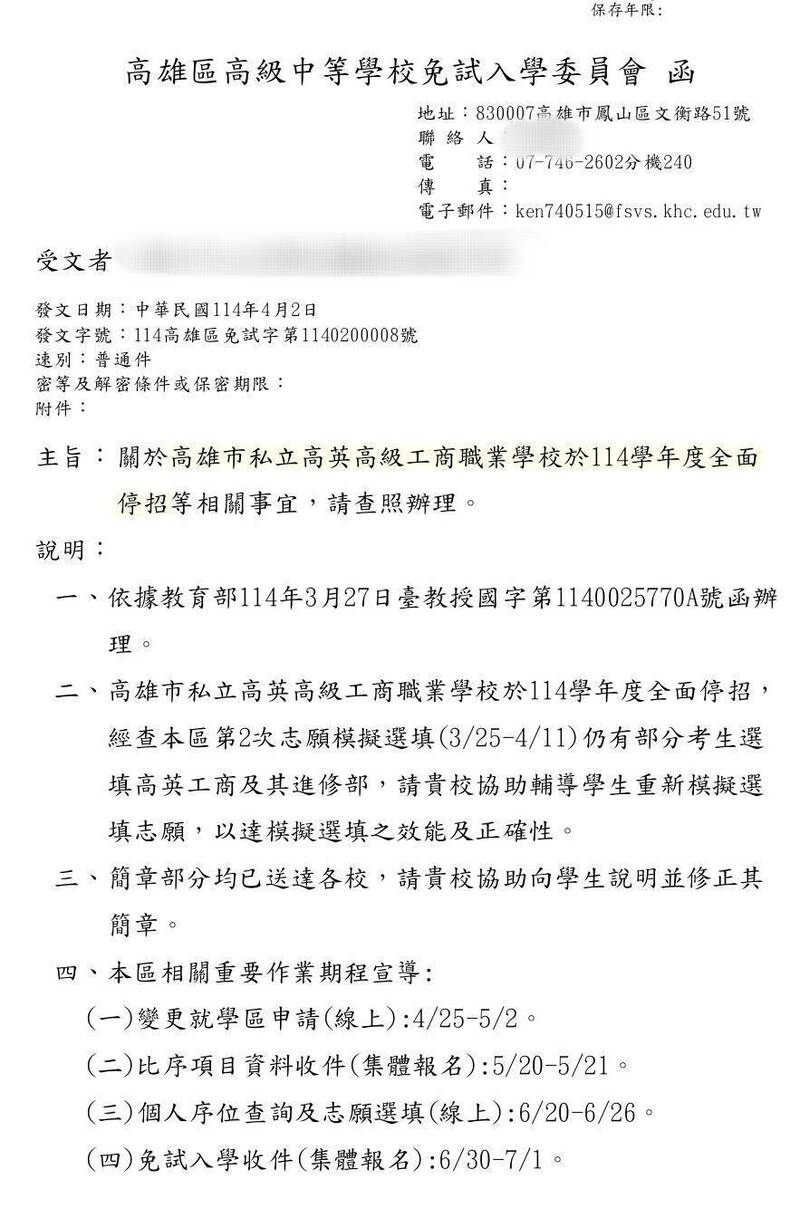 據了解,消息來源為高雄區高級中等學校入學委員會的公文,已發送高雄市各國中,內容指高英工商於114學年度全面停招,但第2次志願模擬選填,仍有部分考生選填高英工商及其進修部,提醒國中各校協助學生重新模擬選填志願,且是依據教育部3月27日的公文指示辦理。