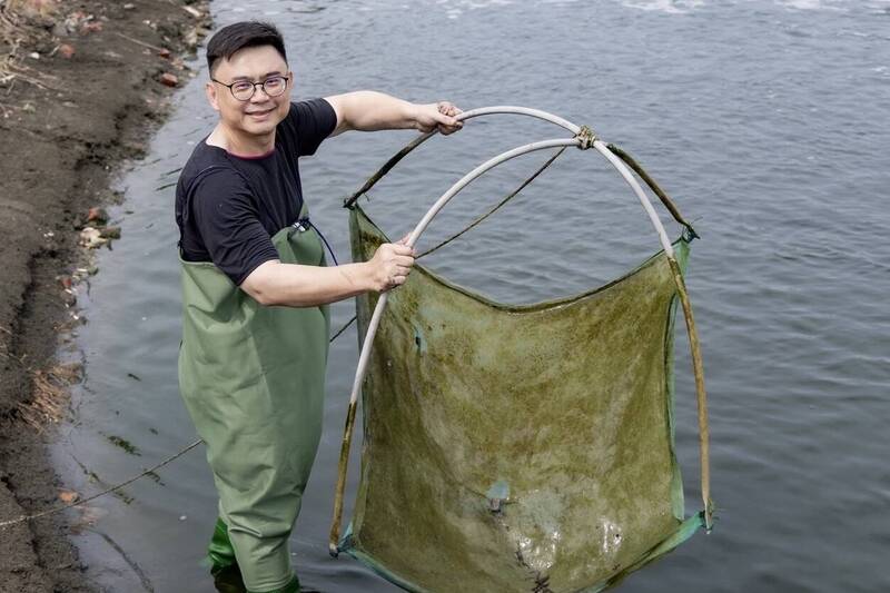 賴瑞隆穿青蛙裝下魚塭體驗漁民作業情況。(賴瑞隆團隊提供)
