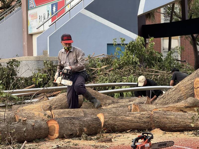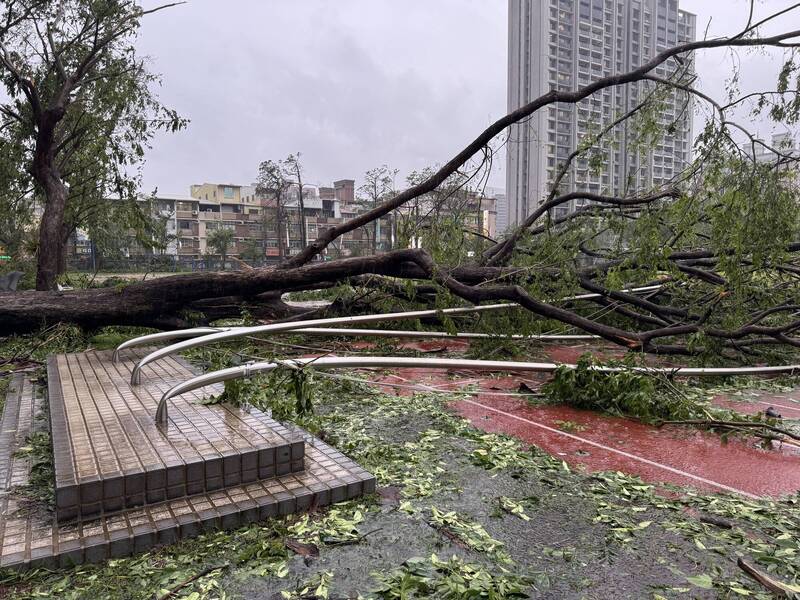 鳳新高中印度紫檀不敵四颱侵襲倒下壓毀旗桿。(校方提供)