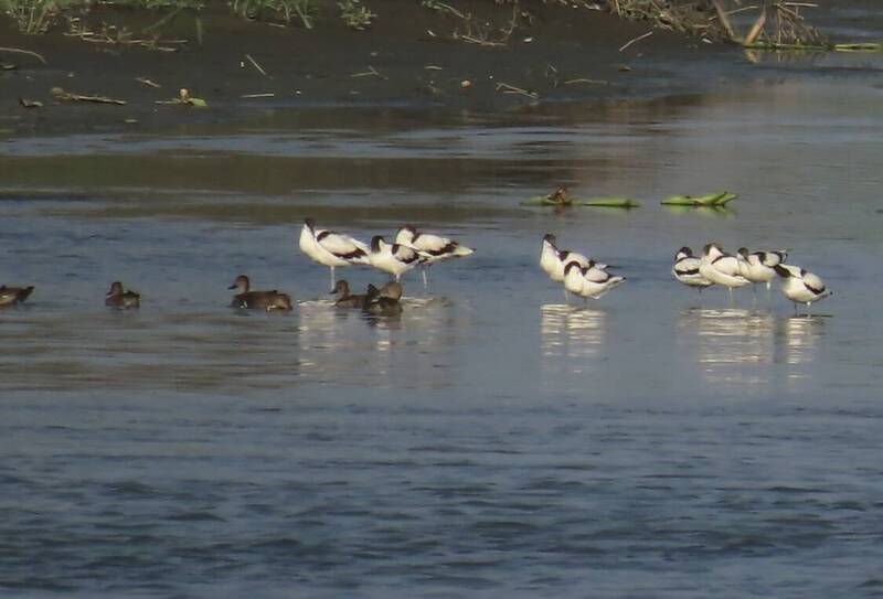 反嘴鴴及小水鴨現身舊鐵橋生態區。(莊景淵提供)
