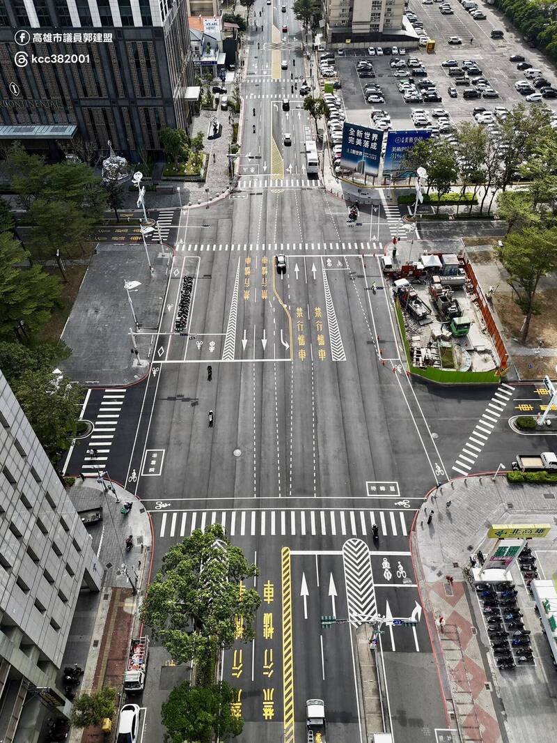 議員郭建盟空拍中華五路與新光路口車道縮減畫面,建議交通局研議改善。(取自郭建盟臉書)