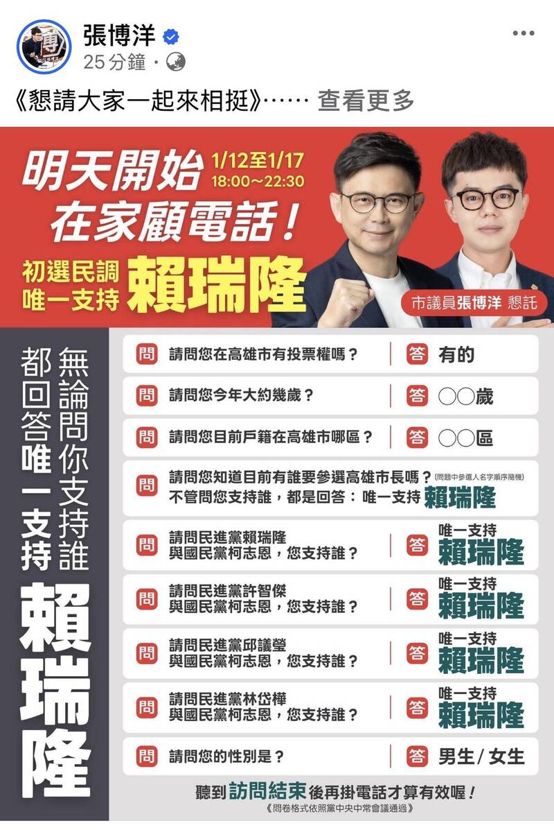 高雄市議員張博洋臉書串連力挺賴瑞隆。(記者葛祐豪翻攝)(記者葛祐豪攝)