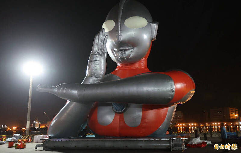 高達15公尺的「超人力霸王」今晚在16號碼頭充氣測試。(記者李惠洲攝)