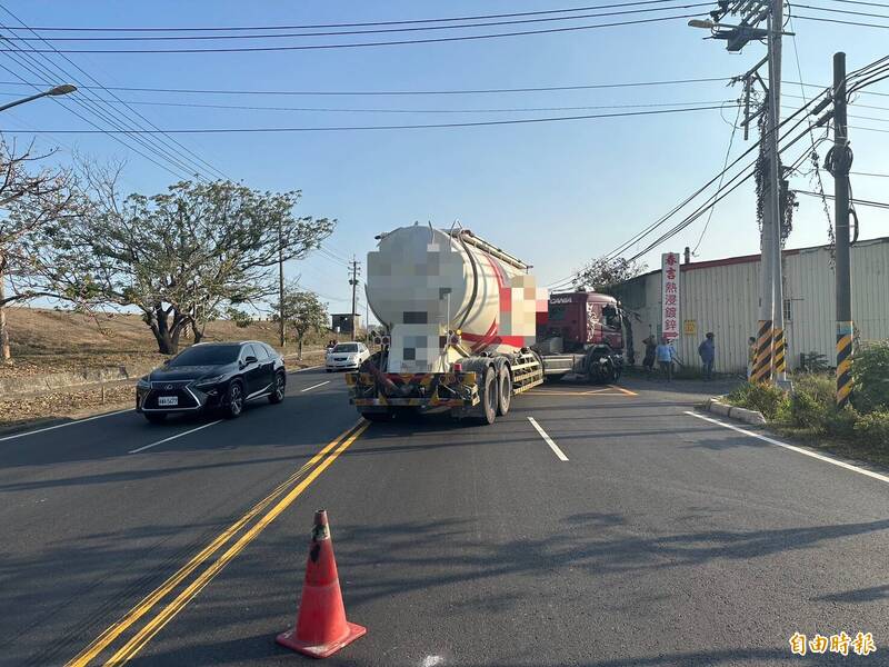 油罐車與微型電動二輪車發生擦撞。(記者洪臣宏攝)