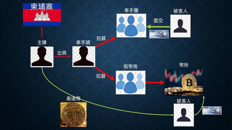 高雄警方破獲虛擬貨幣水房洗錢逾億,詐團洗錢手法。(警方提供)