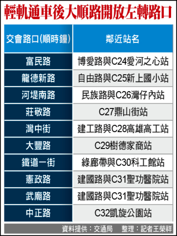 捷運局表示,輕軌大順路段從龍德新路到中正路,一共有卅三處路口,初步評估十處路口在通車後可左轉,未來通車後仍將與交通局持續觀察整體車流狀況,滾動調整交通管理措施。捷運局也重申輕軌大順路段設定今年底完工通車、輕軌全線成圓目標不變。