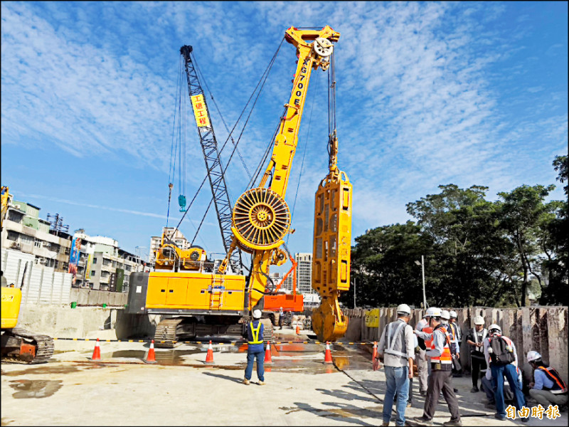 高捷黃線寶業里滯洪池旁Y16站先行施作連續壁。(記者陳文嬋攝)