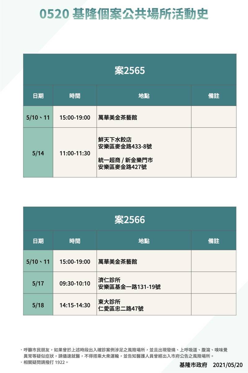 基隆市政府公布案2565、2566兩個確診案例,都有前往台北市萬華美金茶藝館;市政府公布兩案例的公共場所活動史,提醒民眾注意。(圖為基隆市政府提供)