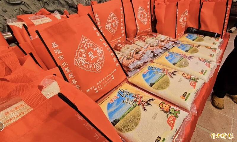 基隆市信義區北聖宮「報關媽」今舉辦「寒冬送暖」,廟方捐贈弱勢者白米、麵條和千元賣場禮券。(記者盧賢秀攝)