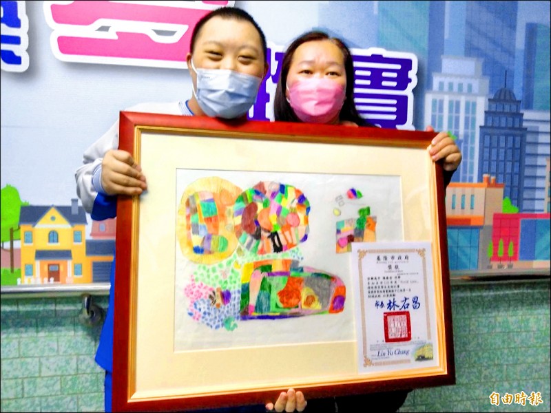 安樂高中國中部特教生陳泰安(左),獲得基隆市國中特教生第一名與評審團大賞,讓媽媽(右)感動不已。(記者俞肇福攝)