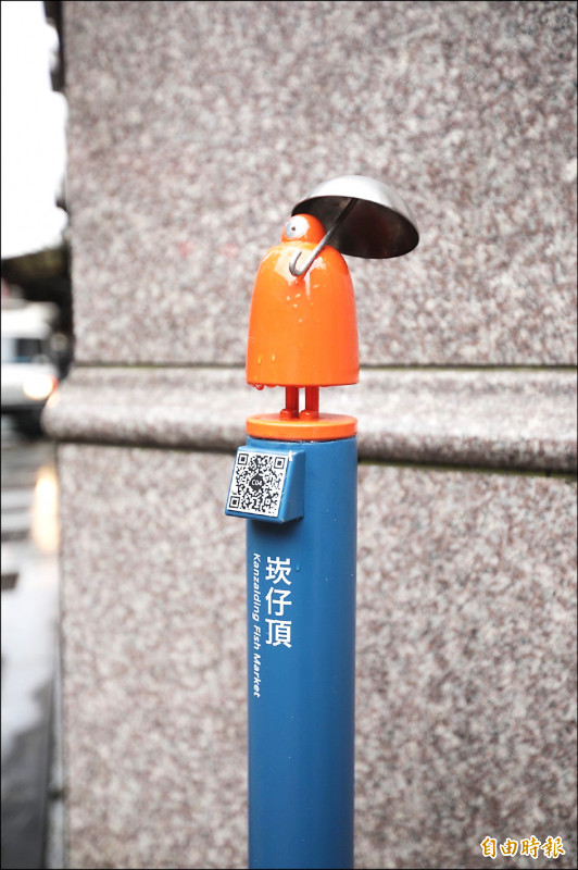 基隆市政府打造基隆城市指標系統,指標牌上方,有個充滿在地印象的橘色撐傘小孩。(記者俞肇福攝)