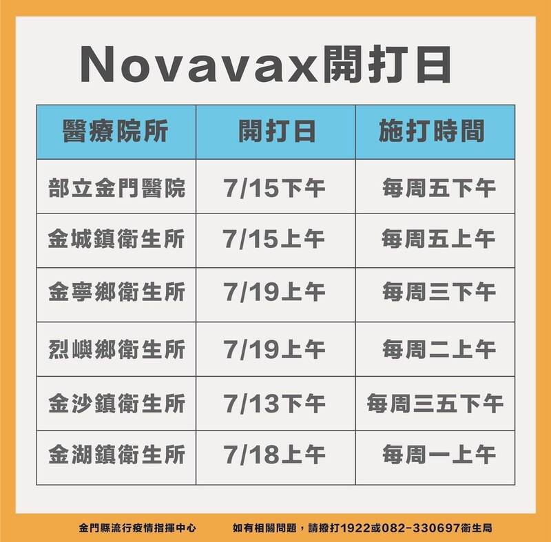 縣府指出,金門醫院及5鄉鎮衛生所預計第1次施打Novavax門診時間分別是:金沙衛生所7月13日下午、金城衛生所7月15日上午、金門醫院7月15日下午、金湖衛生所7月18日上午、金寧衛生所及烈嶼衛生所均為7月19日上午。往後,金門醫院及5鄉鎮衛生所固定接種時段:金門醫院每週5下午;金城衛生所每週5上午;金寧衛生所每週3下午;烈嶼衛生所每週2上午;金沙衛生所每週3、5下午;金湖衛生所每週1上午。