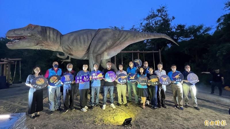 2022金門星光節在長12公尺、高5公尺的霸王龍現身後,於西洪營區由縣長楊鎮浯(左六)等人共同「霸」氣登場。(記者吳正庭攝)