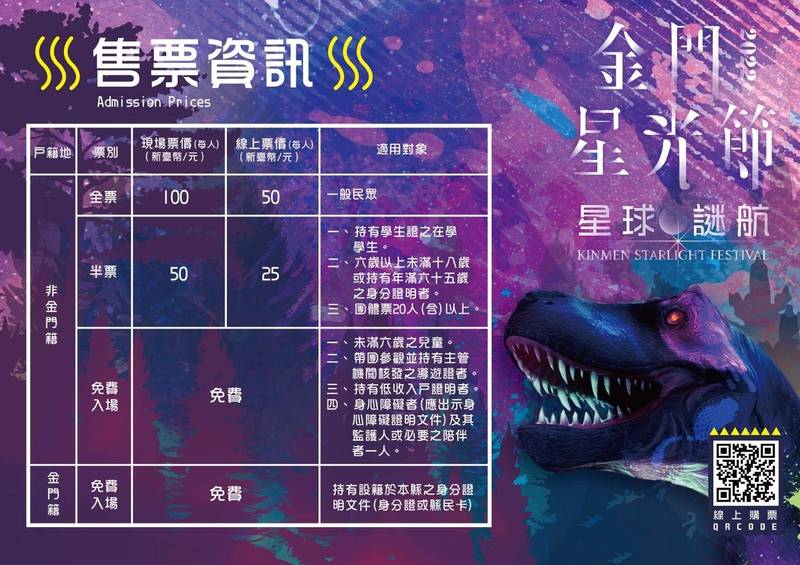 縣府觀光處長丁健剛說,星光節以星球謎航為主軸,從失落的星球、神祕的星際旅程、無限蟲洞、穿越時空到遠古侏儸紀,霸王龍、迅猛龍、三角龍相繼在金門現身,讓遊客隨著迷幻的氛圍,好像走進時空旅程。