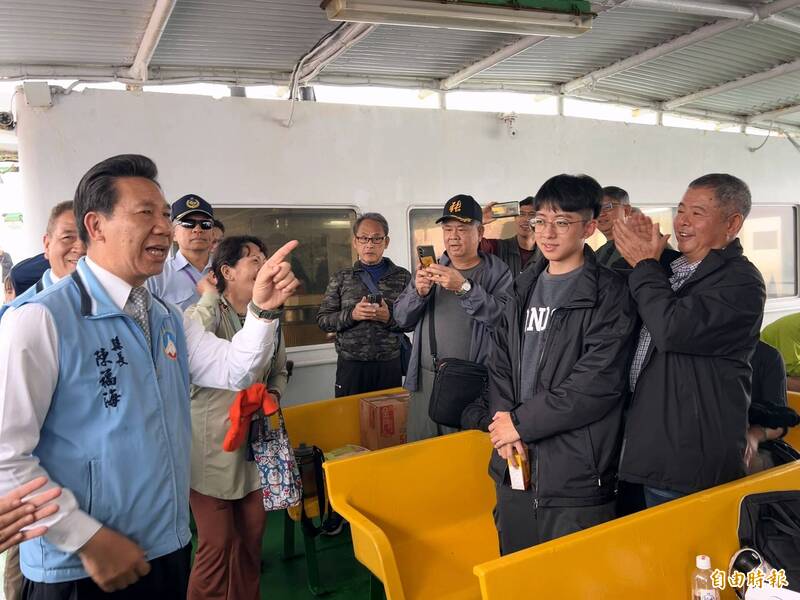 濃霧影響台金海、陸對外交通,縣長陳福海(左一)登上縣府清明專船與鄉親寒暄。(記者吳正庭攝)