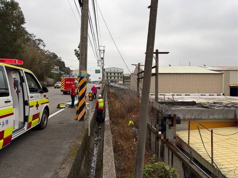 消防人員到場,發現一輛機車墜落路旁2公尺深駁坎,一名男性躺臥在路肩水溝內,另有一名男性掛在一旁台灣中油公司探採事業部鑽探工程處廳舍的尖刺鐵絲圍籬上。(圖由警方提供)