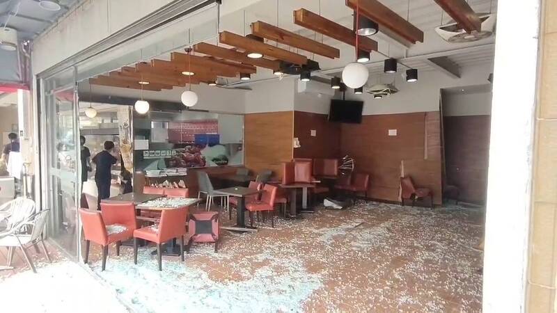 店家整面落地玻璃碎裂,裏頭的餐桌椅也被撞得東倒西歪,滿目瘡痍。(圖由民眾提供)