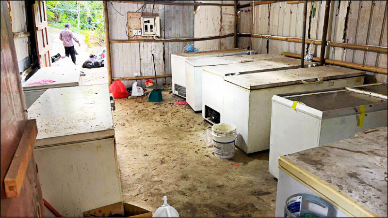頭份山區查獲非法屠宰,鐵皮工寮內多個冰櫃裝滿動物肉塊。(苗縣府提供)