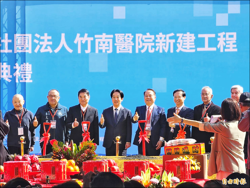 苗栗縣大千健康醫療體系竹南醫院昨舉辦動土典禮,賴清德總統(左四)出席參與,期勉成為守護苗栗健康的堡壘。(記者彭健禮攝)