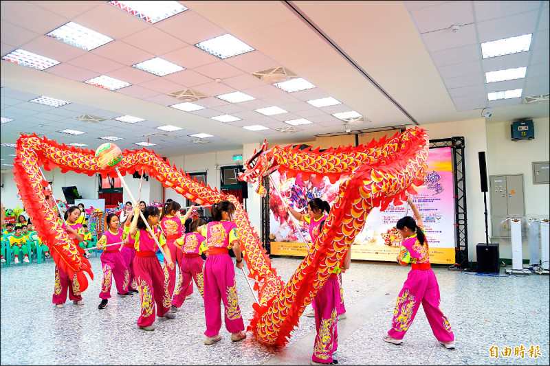 苗栗市公所宣傳新春元宵民俗「(火旁)龍」系列活動,三義鄉僑成國小女子舞龍隊演出造勢。 (記者彭健禮攝)