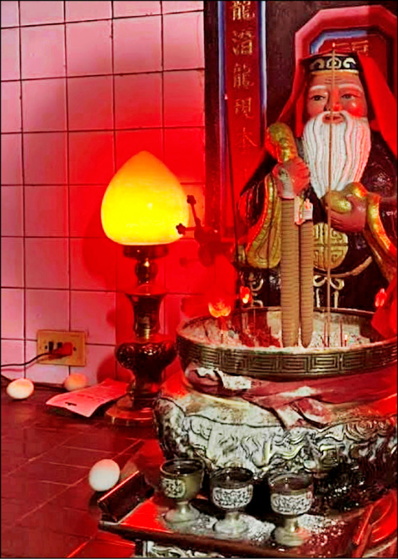 神龕上土地公神尊旁,留有多顆雞蛋。(徐裕逢提供)