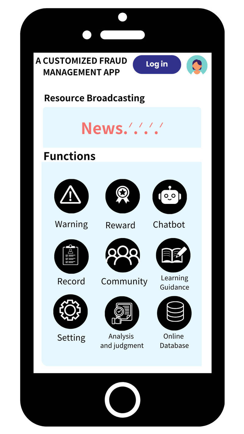 林淑芳說,這個APP設計是結休AI機器人和大數據功能,只要輸入該APP使用者常做的經濟活動型態,就可分析較易遇到或現流行的詐騙型態,使用者可馬上借助機器人,另家族成員也可在該系統建立家庭防護模組,使用者若接獲詐騙訊息,家族成員也會接收到,可火速給予回應止詐。
