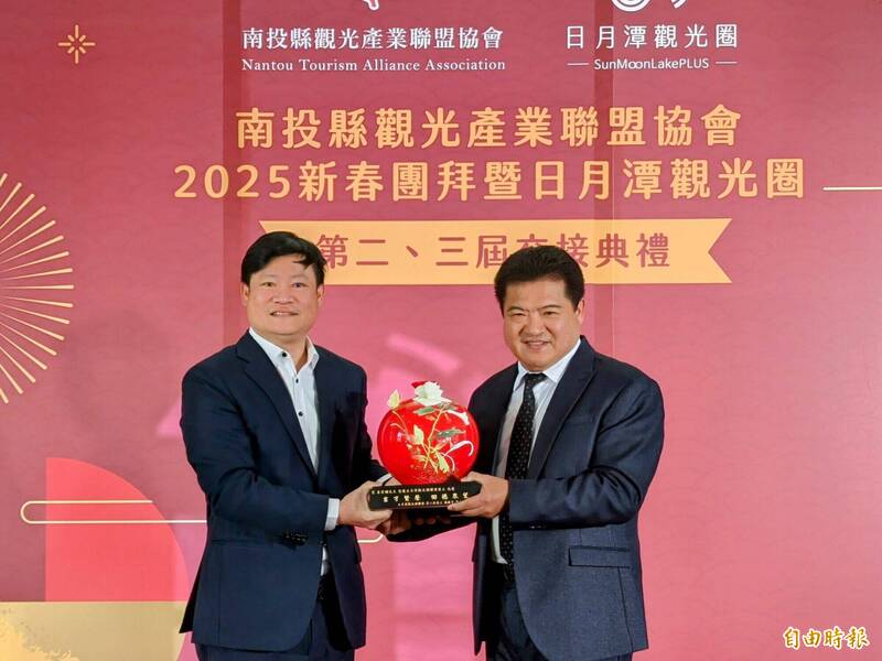 日月潭觀光圈新、舊任盟主李吉田(右)、魏振宇(左)進行交接。(記者劉濱銓攝)