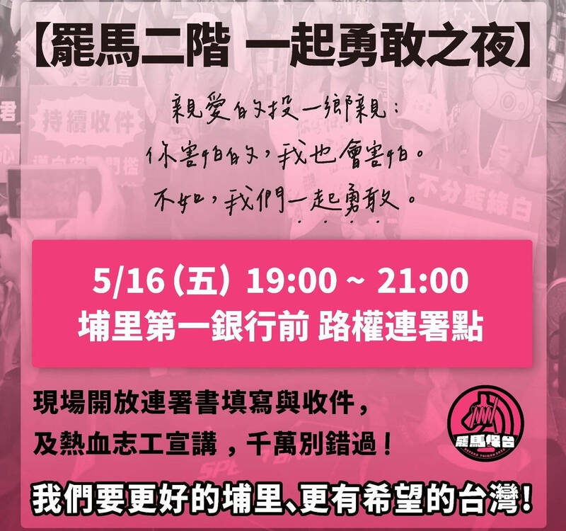罷馬團隊本週五晚間,將在埔里第一銀行前舉辦「一起勇敢之夜」。(「All罷馬」罷團提供)