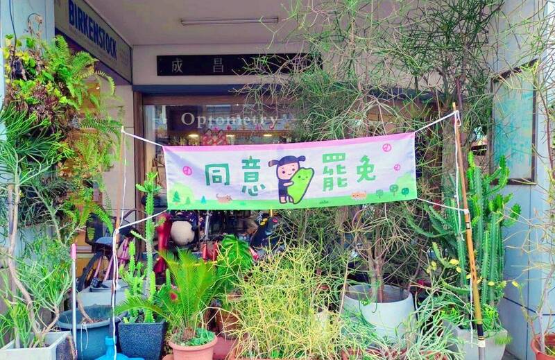 草屯市區已有台派店家在店門口懸掛同罷免橫幅布條。(石育民提供)