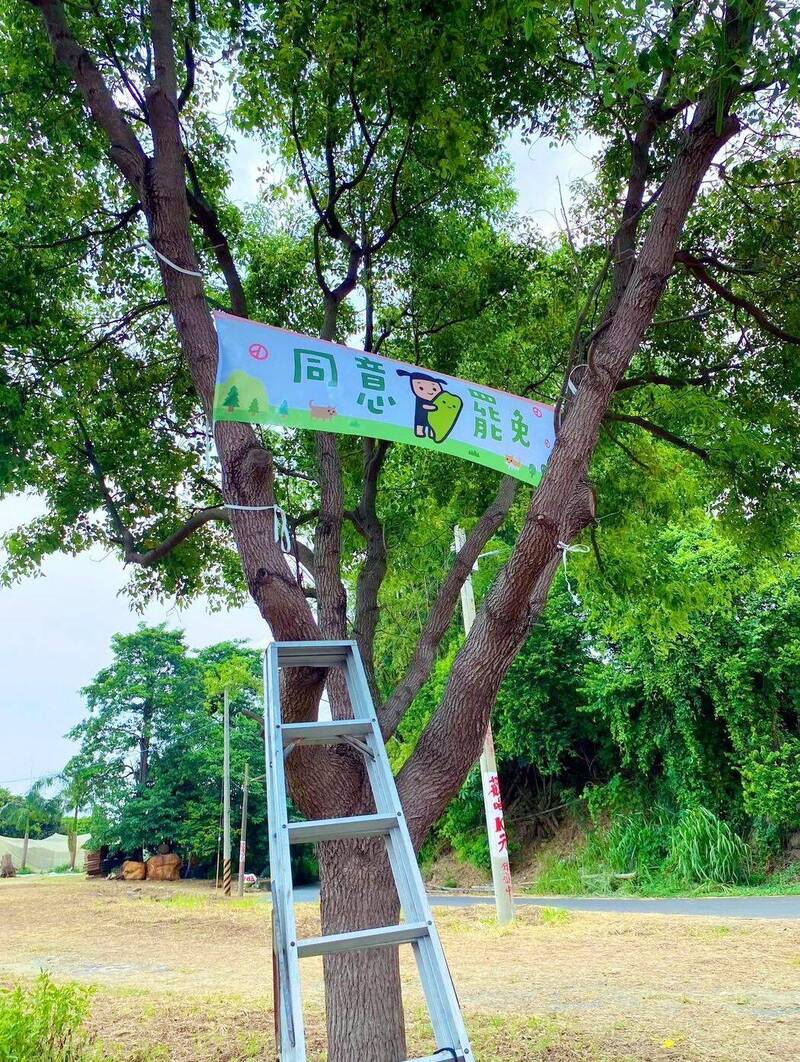 有民眾提供自家農地,讓同意罷免橫幅布條掛在樹上,饒富趣味。(石育民提供)