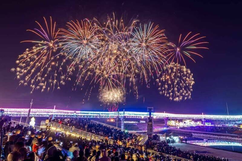 南投首辦國慶焰火,10月10日晚間8點將於貓羅溪畔施放。此為南投燈會於貓羅溪畔施放焰火情形。(南投縣政府提供)