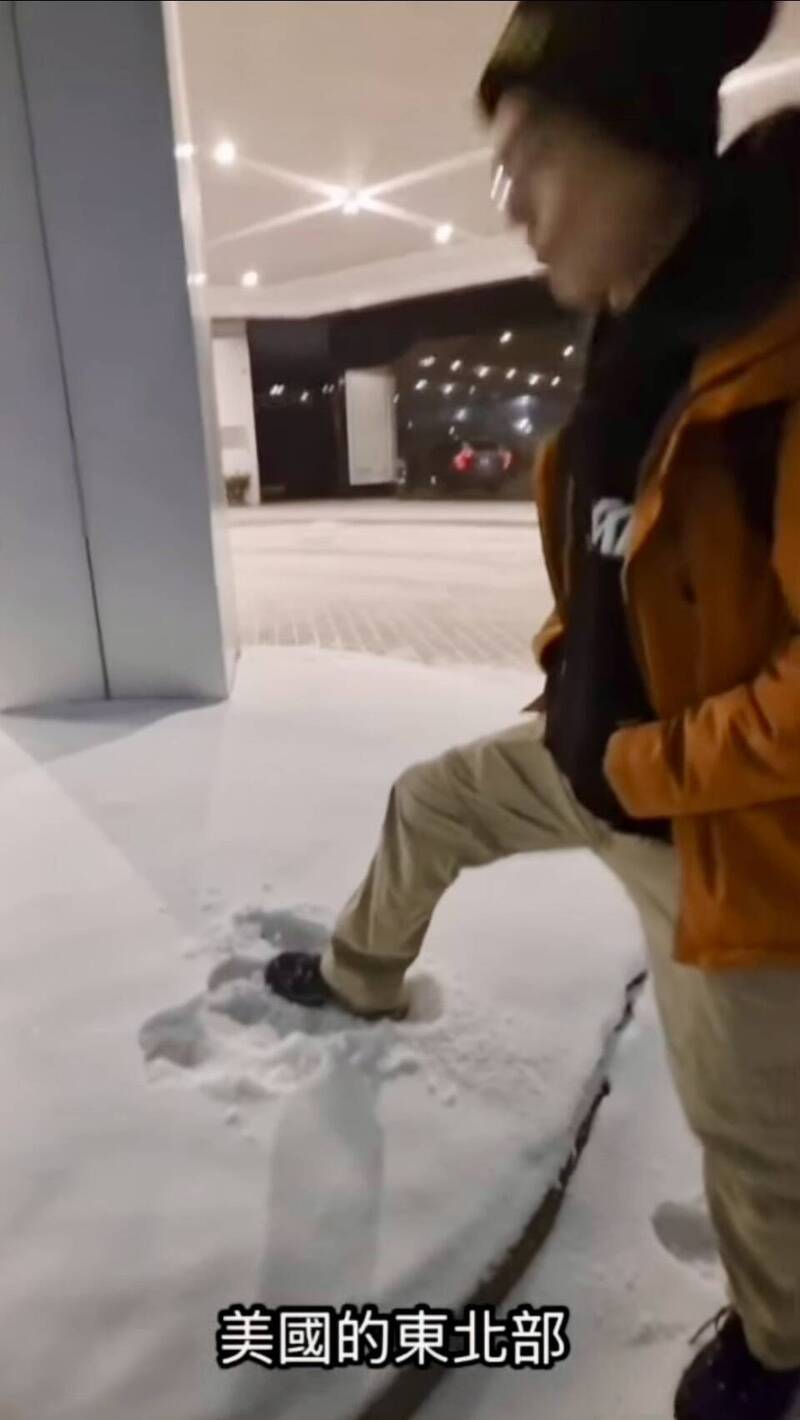 温世政踩踏地上積雪,強調雪很鬆軟表示雪很大下沒多久就積雪很深。(圖擷自温世政臉書)