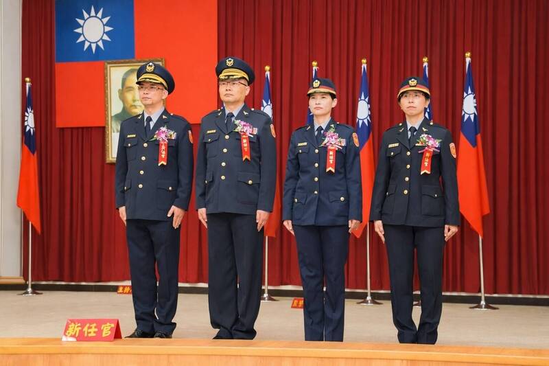 南投縣警察局26日舉行卸、新任分局長交接典禮,圖為新任南投分局長蔡宏澤(左起)、草屯分局長張基銘、埔里分局陳孟君及集集分局長王貞惠。(圖由南投縣警察局提供)