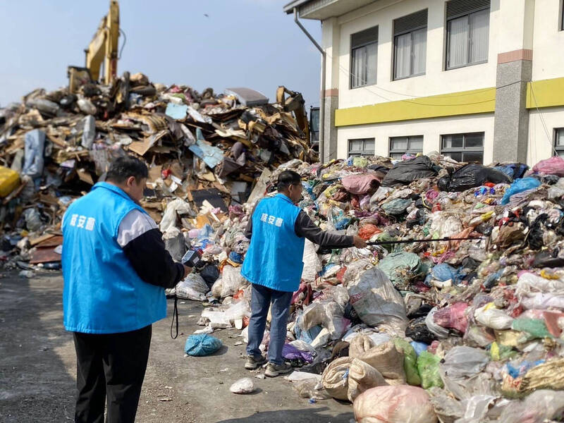核安人員以輻射偵測器在垃圾堆中找出輻射值超標的垃圾。(埔里清潔隊提供)