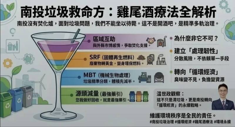 温世政強調,垃圾處理是系統性問題,設置焚化爐非唯一解方,縣府應暫緩推動焚化爐設置,以循環經濟與淨零轉型為核心治理理念,運用雞尾酒療法、也就是包含加強源頭減量、掩埋場整頓等「複合療法」思維處理垃圾問題,否則一意孤行,只會傷害南投、破壞南投人的美麗家園。