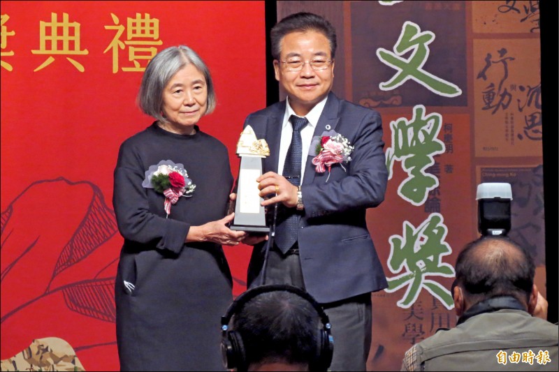 玉山文學獎文學貢獻獎頒給已故臺大中文系教授柯慶明,由柯妻張淑香(左)代表領獎。(記者張協昇攝)