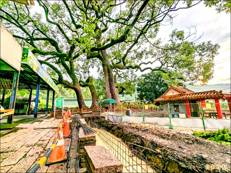 南投水里鄉「三代同堂」大樟樹遭挖斷根,南投縣政府已勒令廠商停工。(記者劉濱銓攝)