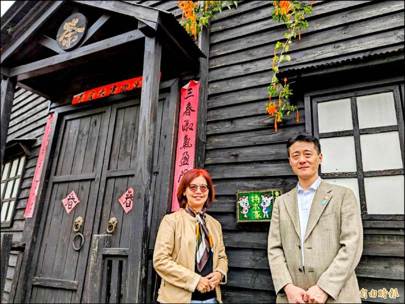 日治時期持木家族在台深耕紅茶產業,經魚池茶農石茱樺(左)等人努力尋人,終於找到其後代,由家族外孫吉村齊(右)來台尋根,並參訪在魚池鹿篙所設置的故居門面。(記者劉濱銓攝)