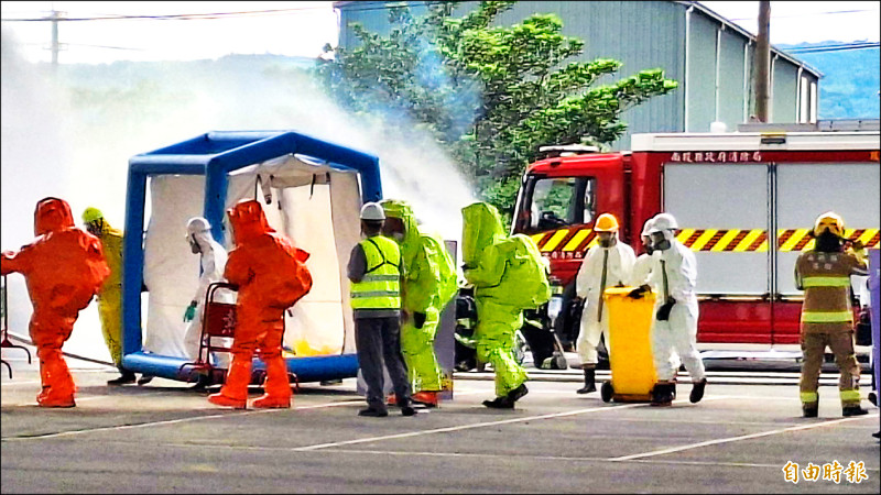 南投縣27日舉辦重大陸上交通事故演習,演練化學槽車毒化物外洩,消防人員著防護衣處理過程。(記者張協昇攝)