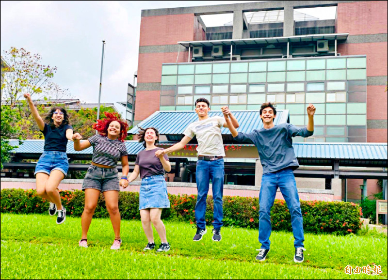 草屯商工5名外籍交換生,左起巴西簡思樂、蕭希希、法國林莉、巴西蕭谷、墨西哥戴米墨。(記者陳鳳麗攝)